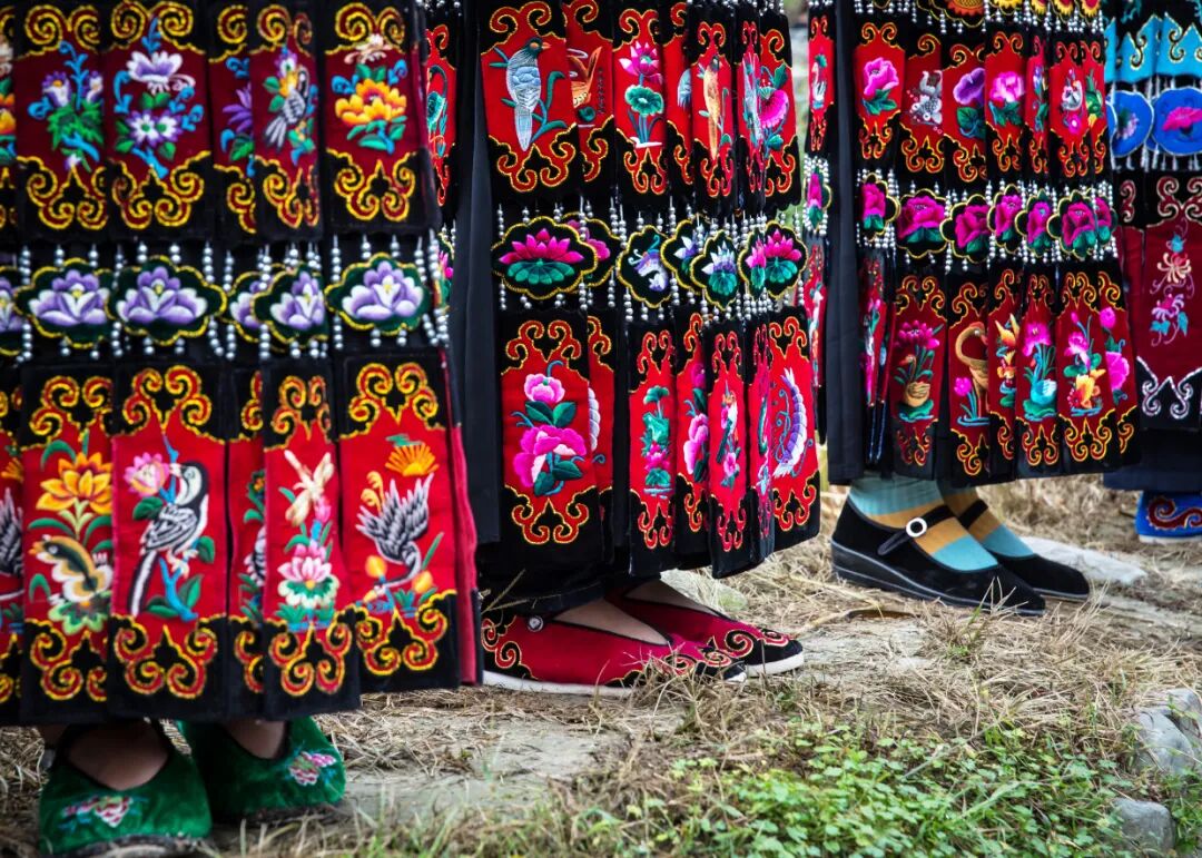 由于苗族的文字已经失传,因此这些承载着文明史的刺绣,在某种意义上就是苗族的文字,不同图纹也代表着不同含义。比如苗龙纹代表着好运,牛纹代表着勤劳和丰收,两者相加就是风调雨顺五谷丰登的意思。再比如蝴蝶代表着传说中的蝴蝶妈妈,是先祖和生命力的代名词,出现蝴蝶纹的地方,就是对先祖的纪念和大地的赞美。